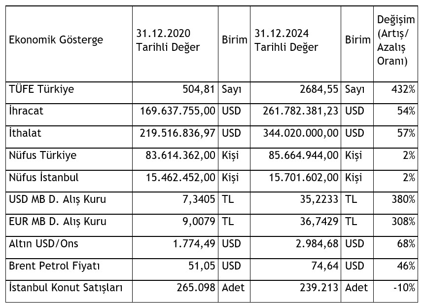 Aşağıdaki tabloda farklı ekonomik göstergelere göre dört yıllık artış oranları gösterilmiştir.